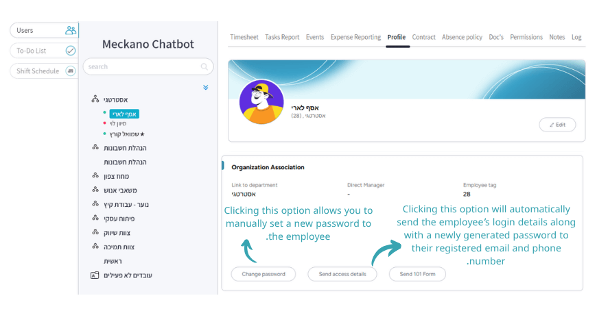 • Clicking this option will automatically send the employee’s login details along with a newly generated password to their registered email and phone number.