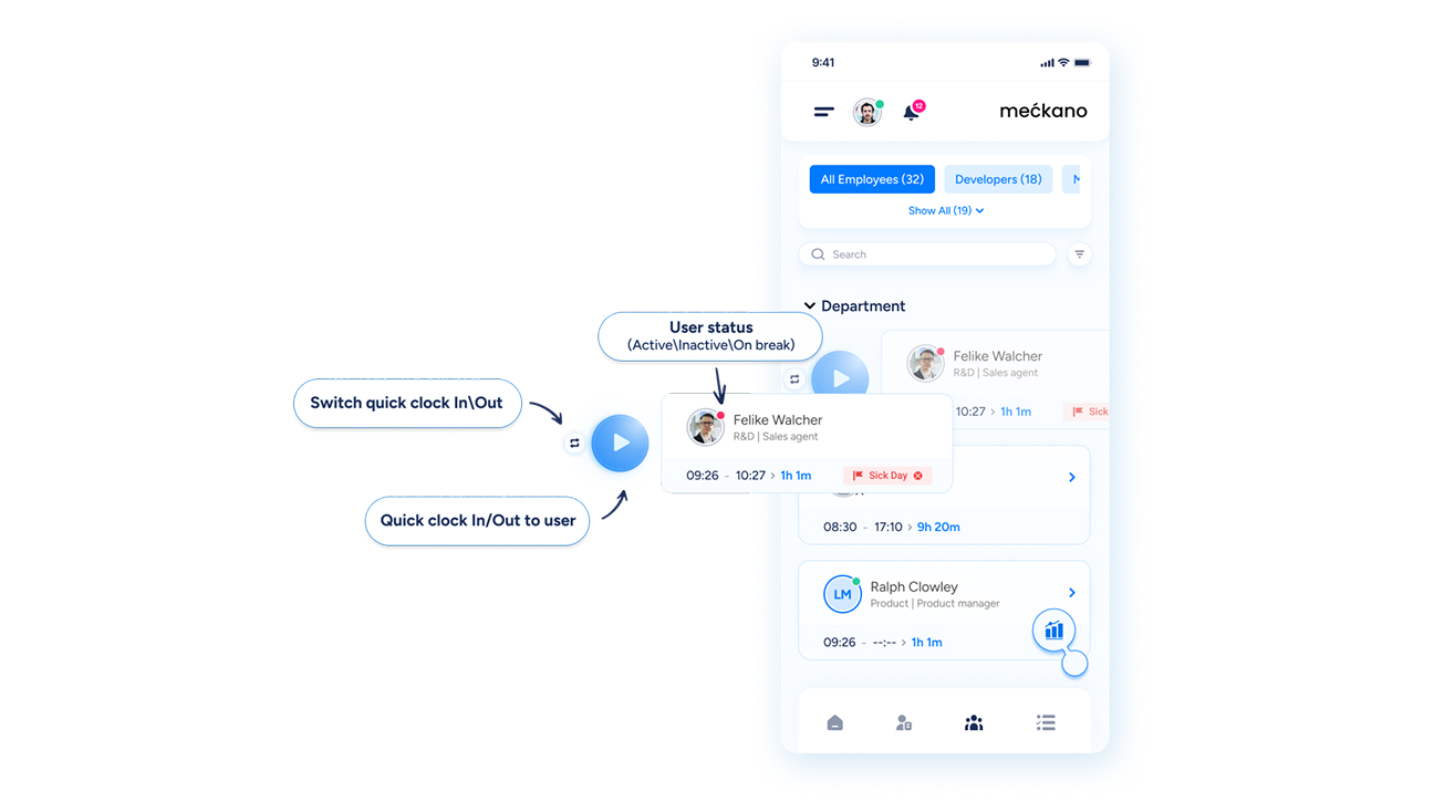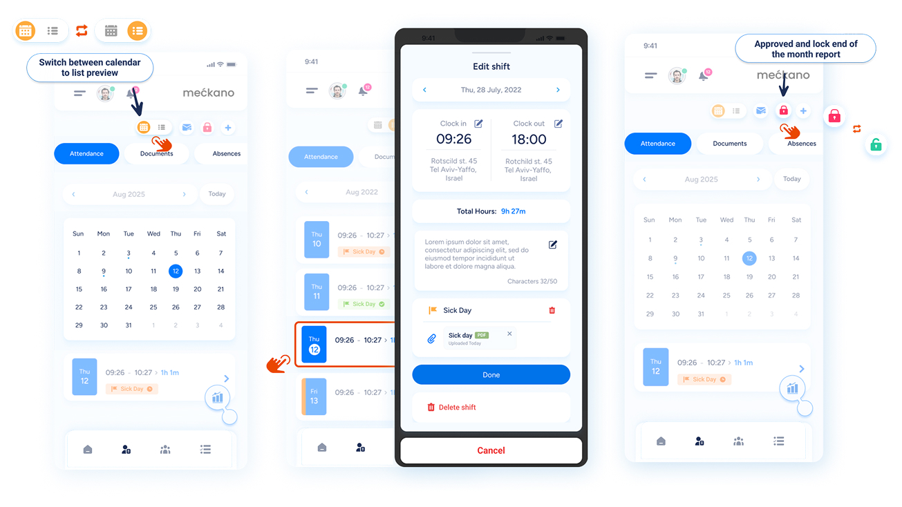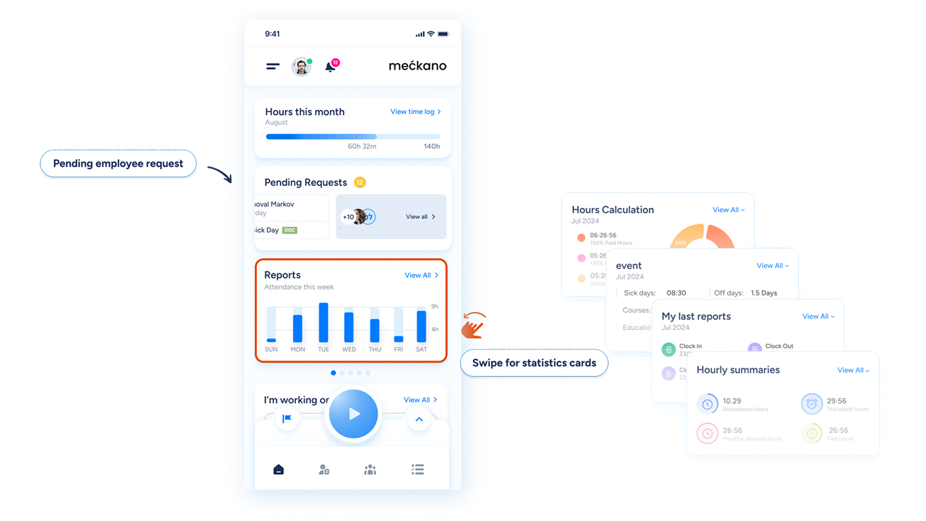 The new Meckano Time Tracking App now introduces a dedicated Manager Version, bringing all essential management tools straight to your mobile device. From now on, you can manage your team anytime, anywhere: