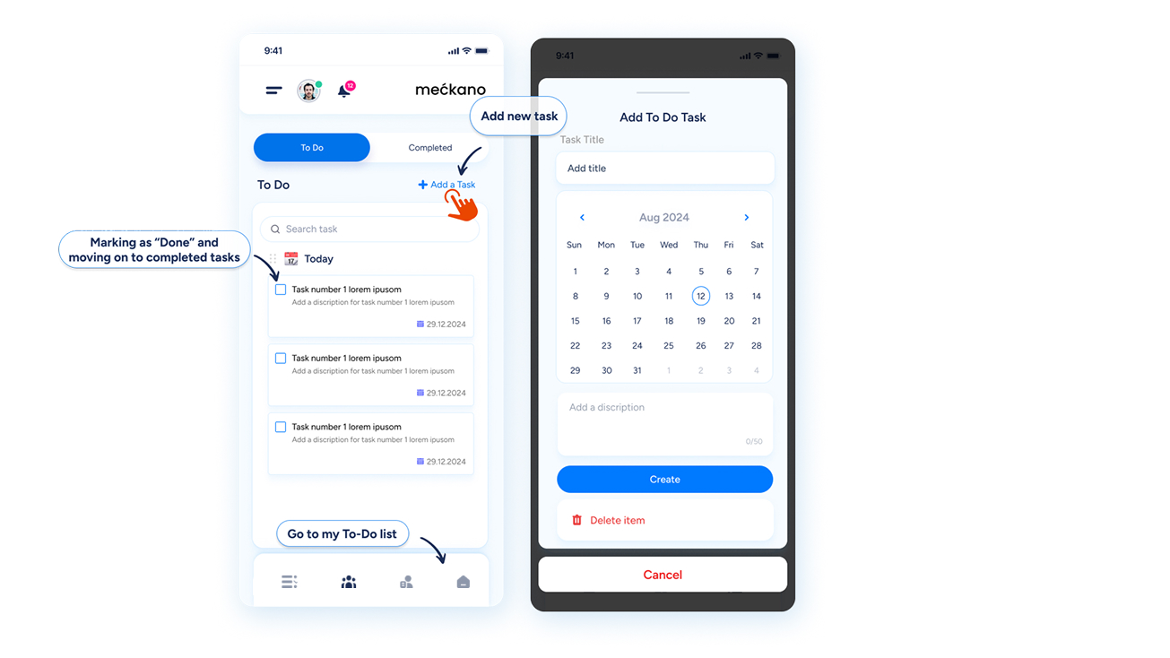 On this screen, you can add a new task, mark a task as completed by checking the box next to it, and view completed tasks by switching to the “Completed” tab.