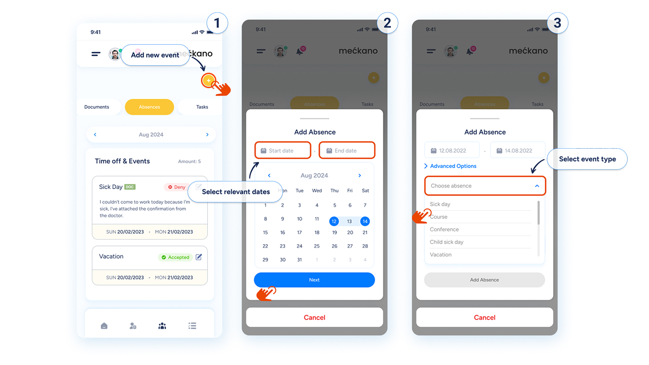 Here you can log events such as vacation, sick leave, or reserve duty, and track their approval status.